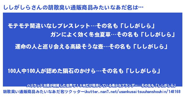 | 意味不明あだ名 | 『ニラ科ししがしら属』『自称ししがしら』 |