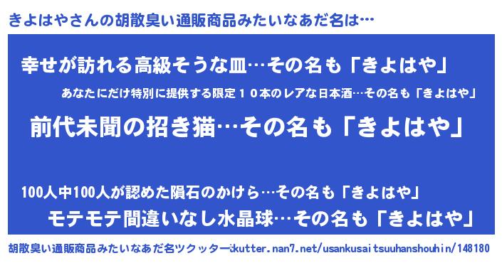 | 男性向けラノベタイトル風あだ名 | 『うちのきよはやが世界を掌握している!』 |