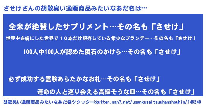 | ヒーロー風カッコイイあだ名 | 『正義の使者させけ』『炎刃騎士サセ』 |