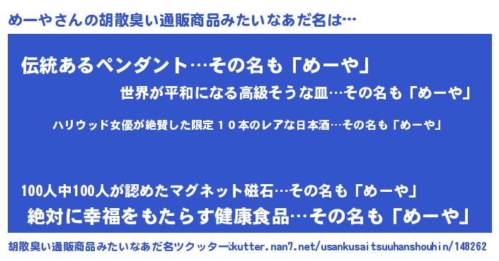 | 男性向けラノベタイトル風あだ名 | 『メーヤスレイヤー』 |