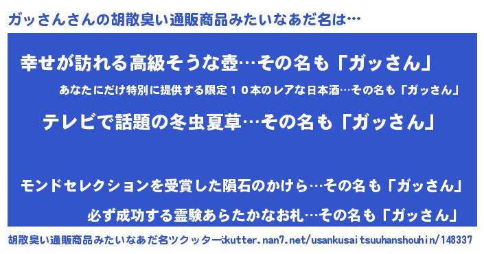 | 意味不明あだ名 | 『なめこ科ガッさん属』『自称ガッさん』 |