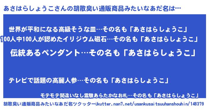 | 意味不明あだ名 | 『とにかく怪しいあさはらしょうこ』 |