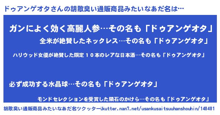 | 意味不明あだ名 | 『住所不定無職ドゥアンゲオタ(39歳)』 |