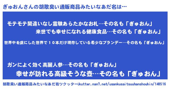 | 男性向けラノベタイトル風あだ名 | 『この素晴らしい世界にぎゅおんを!』 |