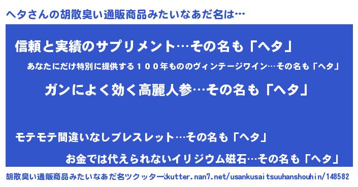 | 男性向けラノベタイトル風あだ名 | 『緋弾のヘタ』『はたらくヘタさま!』 |
