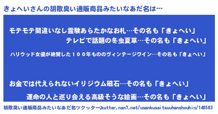 | 意味不明あだ名 | 『住所不定無職きょへい(1歳)』 |