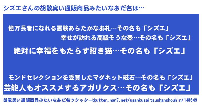 | ヘコむあだ名 | 『シズエ(笑)』『シズもー』『シズを』 |
