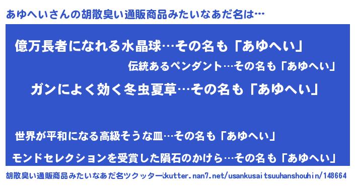 | 意味不明あだ名 | 『自称あゆへい』『ペロリンあゆへい』 |
