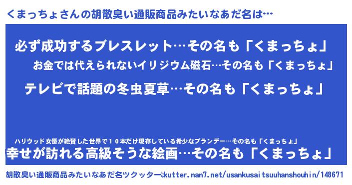 | 意味不明あだ名 | 『自称くまっちょ』『ペロリンくまっちょ』 |