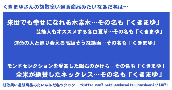 | 意味不明あだ名 | 『くきまゆフォーエバー』『自称くきまゆ』 |