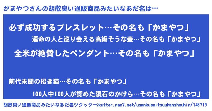 | 男性向けラノベタイトル風あだ名 | 『かまやつの嫁は女の子じゃないと思った?』 |