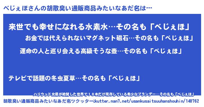 | 男性向けラノベタイトル風あだ名 | 『べじぇほ~年齢イコール彼女いない歴の魔法使い~』 |