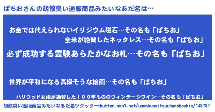 | 男性向けラノベタイトル風あだ名 | 『ぱちおの憂鬱』『魔弾の王とぱちお』 |