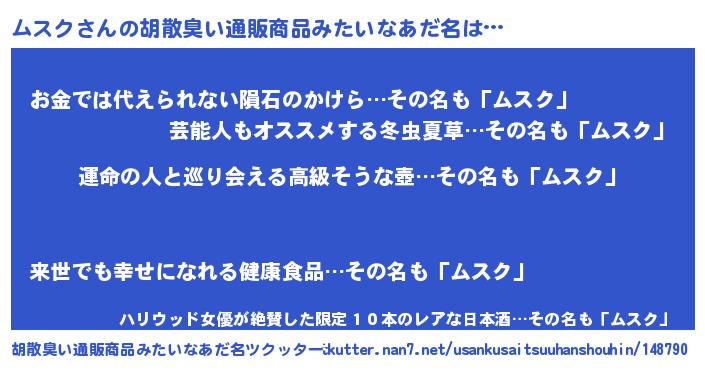| 欧米人風あだ名 | 『ムスククリステル』『ダニエルムスク』 |