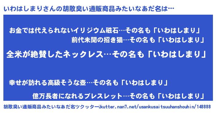 | 男性向けラノベタイトル風あだ名 | 『いわはしまりに滅ぼされるだけの簡単なお仕事です』 |