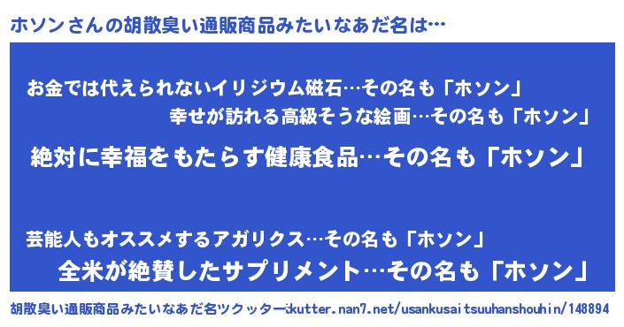 | 男性向けラノベタイトル風あだ名 | 『ホソンという概念が存在しない退屈な世界 』 |