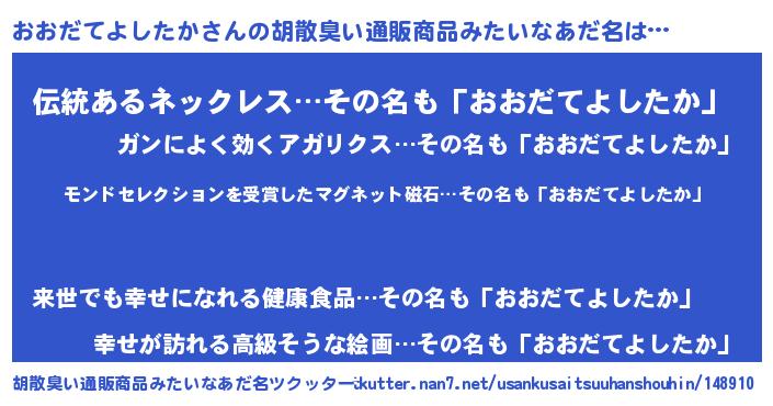 | 男性向けラノベタイトル風あだ名 | 『ノーゲーム・ノーオオダテヨシタカ』 |