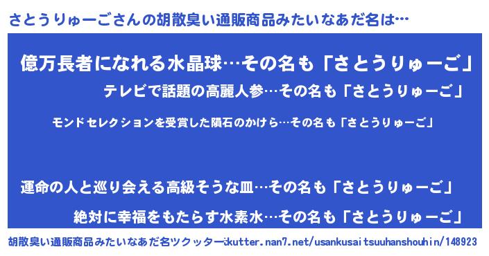 | 男性向けラノベタイトル風あだ名 | 『ノーゲーム・ノーサトウリューゴ』 |