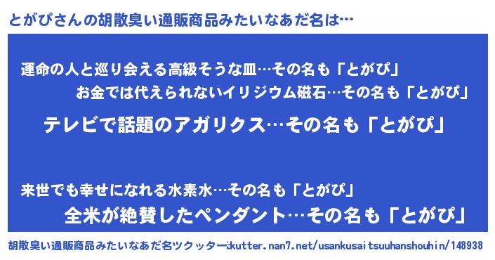 | 意味不明あだ名 | 『たけのこ科とがぴ属』『自称とがぴ』 |