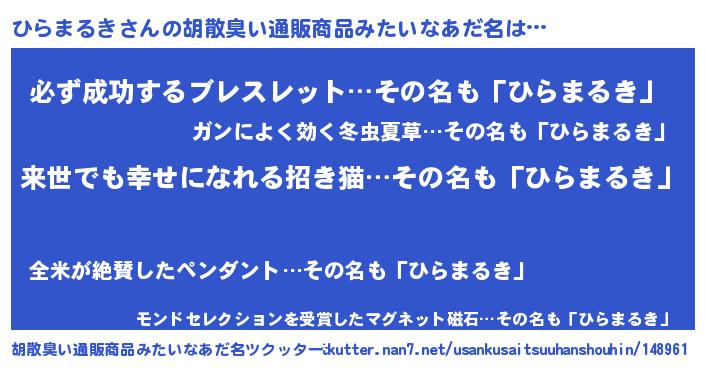 | ヘコむあだ名 | 『ひらまるき(笑)』『ひらにー』 |