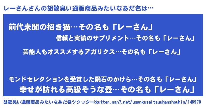 | 男性向けラノベタイトル風あだ名 | 『Re:レーさんから始める異世界生活』 |