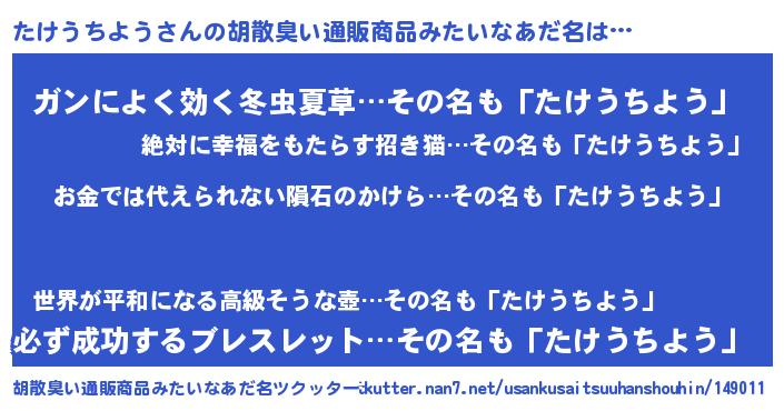 | ヘコむあだ名 | 『たけっふぃ~』『たけうちよう(震え声)』 |