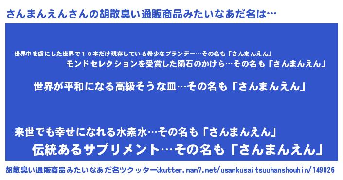 | 男性向けラノベタイトル風あだ名 | 『転生したらさんまんえんだった件』 |