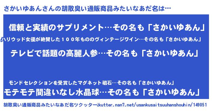 | 意味不明あだ名 | 『自称さかいゆあん』 |