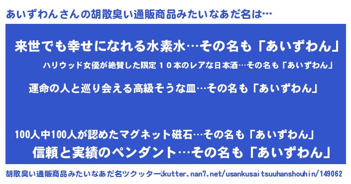| 男性向けラノベタイトル風あだ名 | 『あいずわん~年齢イコール彼女いない歴の魔法使い~』 |