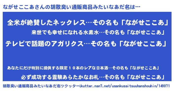 | 男性向けラノベタイトル風あだ名 | 『Re:ながせここあから始める異世界生活』 |