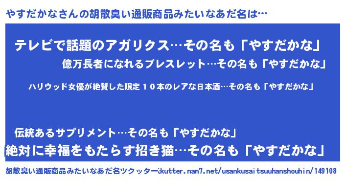 | 意味不明あだ名 | 『住所不定無職やすだかな(39歳)』 |