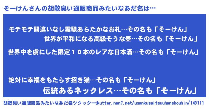 | 意味不明あだ名 | 『住所不定無職そーけん(62歳)』 |