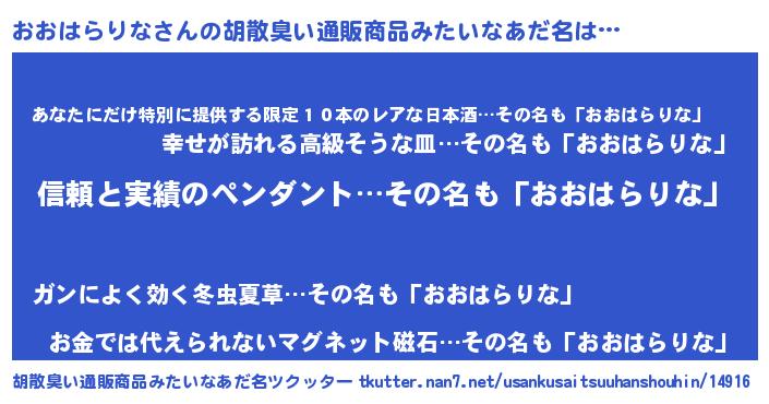 | 意味不明あだ名 | 『とにかく怪しいおおはらりな』 |