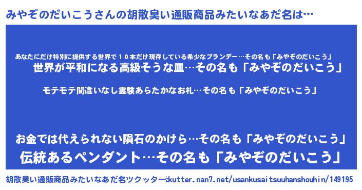 | 男性向けラノベタイトル風あだ名 | 『みやぞのだいこうの憂鬱』 |