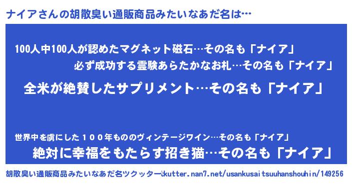| 意味不明あだ名 | 『ニラ科ナイア属』『永久保存ナイア』 |