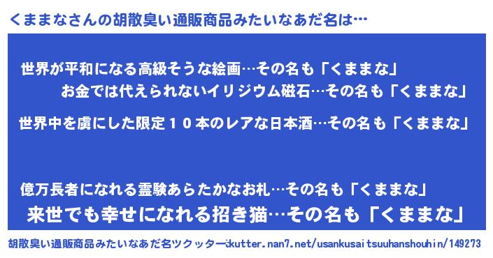 | ヒーロー風カッコイイあだ名 | 『仮面クマダー』『ウルトラくままなマン』 |