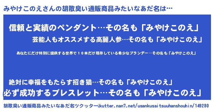 | 意味不明あだ名 | 『住所不定無職みやけこのえ(91歳)』 |