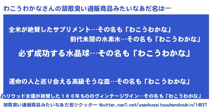 | 男性向けラノベタイトル風あだ名 | 『ワコウワカナスレイヤー』 |