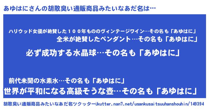 | 男性向けラノベタイトル風あだ名 | 『あゆはにの憂鬱』『魔弾の王とあゆはに』 |