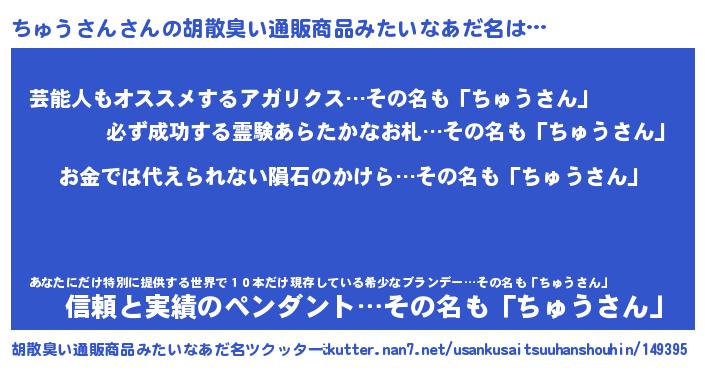 | ヒーロー風カッコイイあだ名 | 『慈愛の使者ちゅうさん』『暗黒騎士チュ』 |