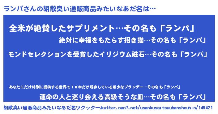 | 男性向けラノベタイトル風あだ名 | 『ランパに滅ぼされるだけの簡単なお仕事です』 |
