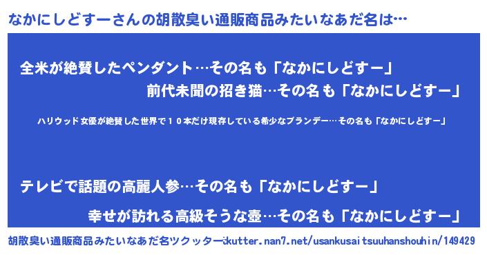 | 意味不明あだ名 | 『住所不定無職なかにしどすー(95歳)』 |