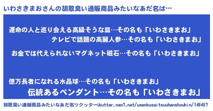 | 男性向けラノベタイトル風あだ名 | 『おまえをオタクにしてやるから、俺をいわさきまおにしてくれ! 』 |