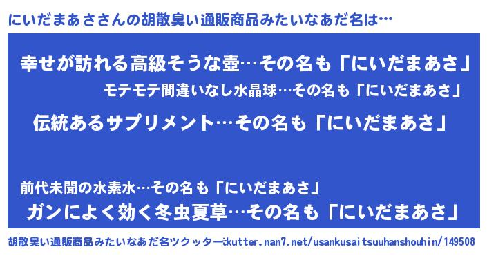 | 男性向けラノベタイトル風あだ名 | 『にいだまあさの嫁は女の子じゃないと思った?』 |