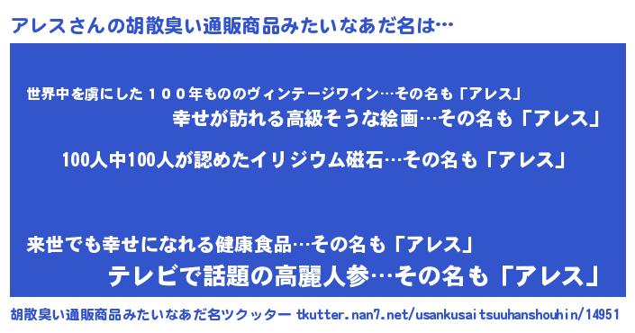 | 男性向けラノベタイトル風あだ名 | 『はたらくアレスさま!』 |