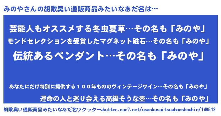 | 意味不明あだ名 | 『とにかく怪しいみのや』『自称みのや』 |