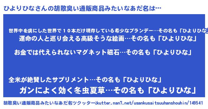 | 男性向けラノベタイトル風あだ名 | 『おまえをオタクにしてやるから、俺をひよりひなにしてくれ! 』 |