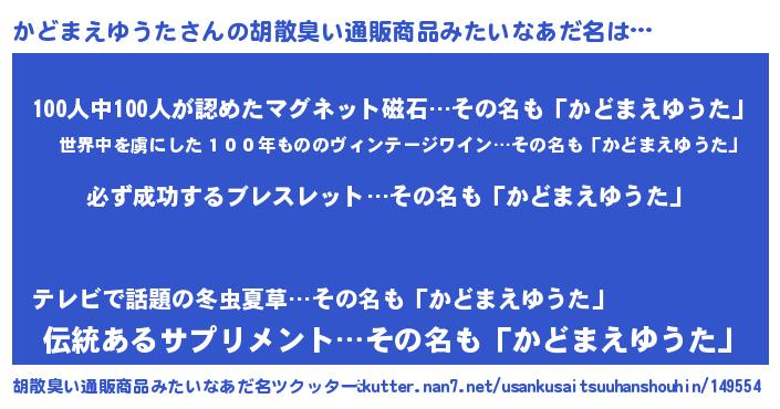 かどまえゆうたさんの胡散臭い通販商品みたいなあだ名をツクッター!