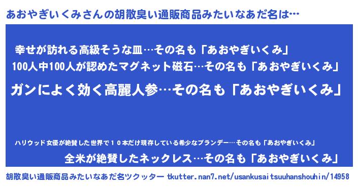 | 意味不明あだ名 | 『自称あおやぎいくみ』 |