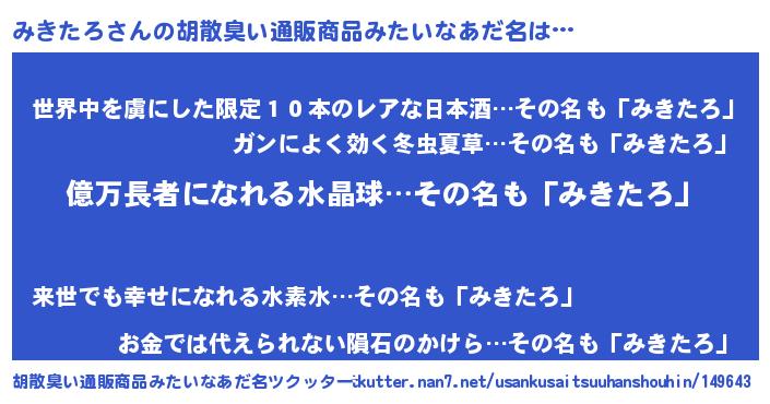 | 意味不明あだ名 | 『ヨモギ科みきたろ属』『自称みきたろ』 |